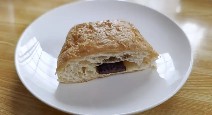 中にチョコがぎっしり入っているわけでなく、チョコの主張は控えめ、甘さも控えめで、コーヒーとの相性が抜群です。全体としては、通常のパン・オ・ショコラと大きな差を感じない完成度です。